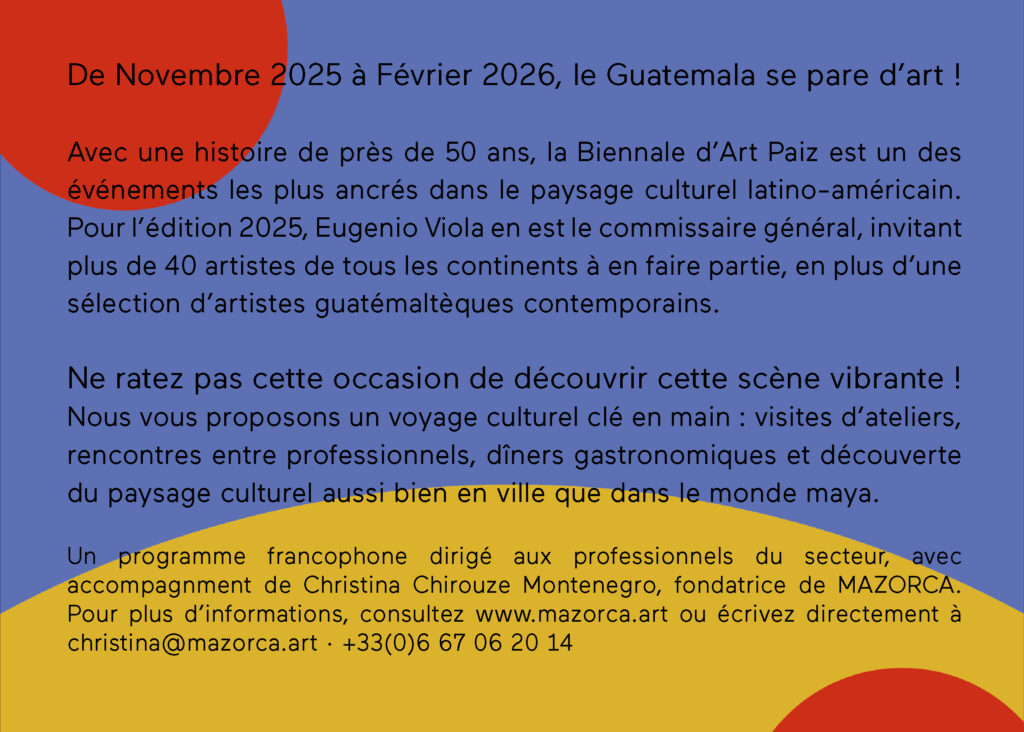 Formada en estudios latinoamericanos y gestión de proyectos culturales, Christina Chirouze Montenegro ha dedicado su vida en tender puentes entre sus dos tierras: Francia y Guatemala, y, más ampliamente, entre Europa y América Latina.