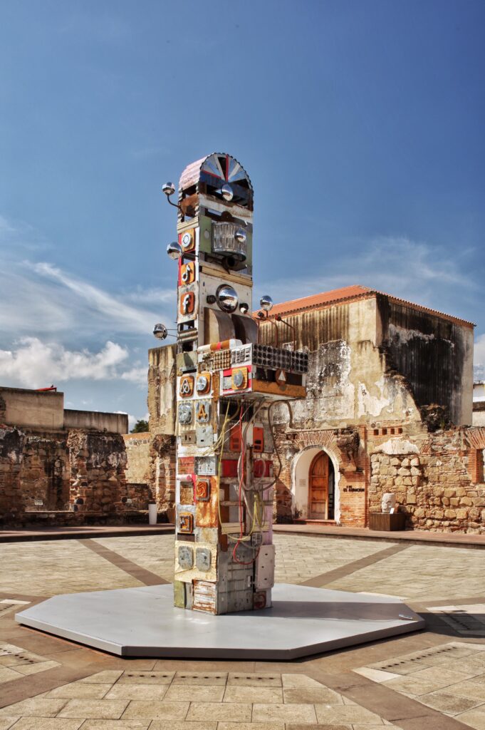 SV: À la Biennale Paiz, j’ai réalisé une sculpture d’environ 7 mètres de haut. En raison de sa hauteur, il n’était pas conseillé de construire la structure en bois, mais plutôt en métal, et je ne pouvais pas pénétrer le sol pour ancrer la base, puisque le site est classé au Patrimoine mondial de l’UNESCO. Cela a rendu le projet extrêmement compliqué. Mais la base a été si bien réalisée qu’elle est presque invisible. J’ai conçu le design avec les connaissances limitées que j’ai en structures, puis j’ai présenté ce design à un ingénieur en structures pour qu’il me dise si l’œuvre pouvait résister aux séismes et au vent, et quelles modifications ou précautions il fallait apporter.