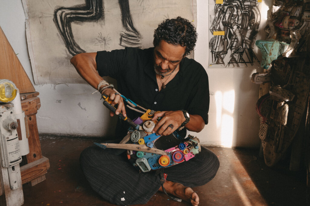 Simón Vega (El Salvador, 1972) en a pleinement conscience, car ces contrastes constituent précisément son terrain de jeu. Artiste à la carrière internationale solidement établie, Vega a développé une pratique qui se déploie entre la sculpture, l’installation, le dessin et la construction d’artefacts, en ayant recours à des matériaux récupérés et à l’architecture informelle. Il a présenté son travail aux États-Unis, en Europe, en Amérique latine et au Japon, notamment à la 55ᵉ Biennale de Venise, à la 9ᵉ Biennale de La Havane, au Bronx Museum, au festival de musique Coachella et au Centre Pompidou à Paris. Il a exposé en solo au Parrish Art Museum de Water Mill (New York), au Musée d’art et de design contemporain du Costa Rica, à la galerie Hilger Next à Vienne et à Locust Projects à Miami. L’œuvre de Vega fait partie d’importantes collections publiques et privées, telles que celles du Pérez Art Museum de Miami, du Museo Reina Sofía de Madrid, du Musée d’art et de design contemporain du Costa Rica, de la collection Sanziany au palais Rasumofsky à Vienne, du Museo del Barrio de New York, de la National Gallery of Art de Washington D.C. et du Harvard Museum. Il participe actuellement à la 24ᵉ Biennale d’art Paiz au Guatemala avec la sculpture intitulée Estela del gobernante F.