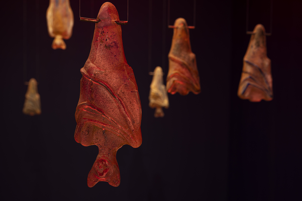 Durante los años 2022-2023 estuve trabajando sobre el tema de los murciélagos y conocí a un grupo de científicos del Smithsonian Tropical Research Institute. La doctora Rachel Page del Smithsonian me dio unas grabaciones de diversos sonidos que hacen los murciélagos y los utilicé para hacer una banda sonora que complementó una colonia de murciélagos en vidrio que exhibí en un pequeño espacio oscuro, y que llamé Refugio. Esa fue mi primera instalación.